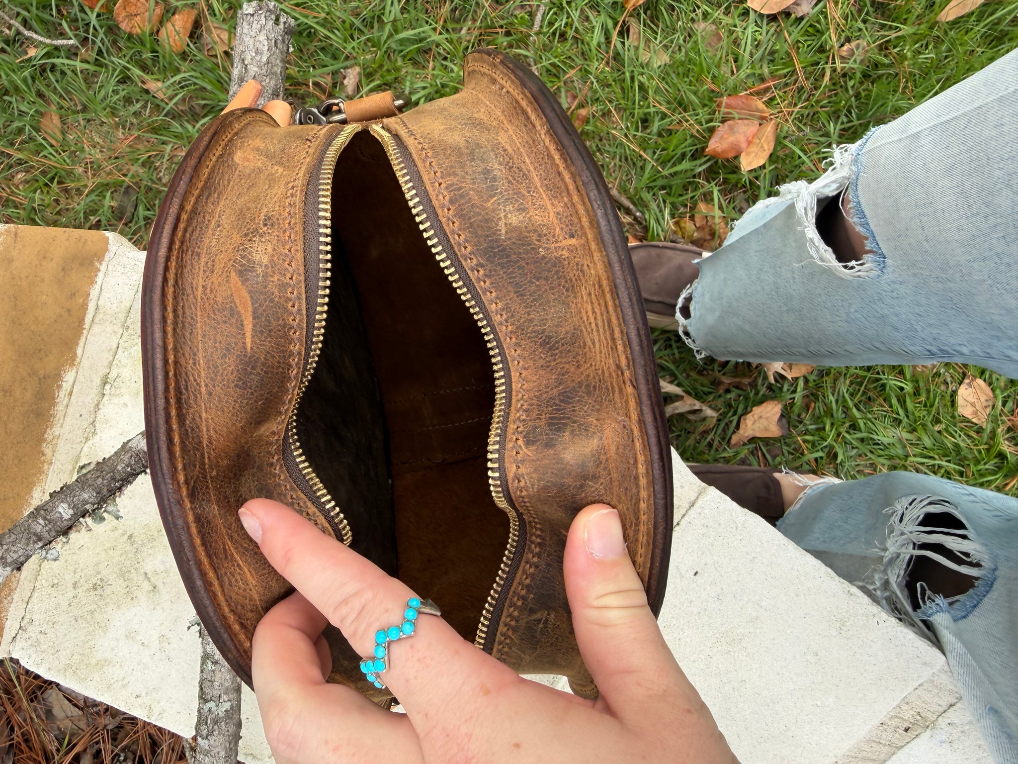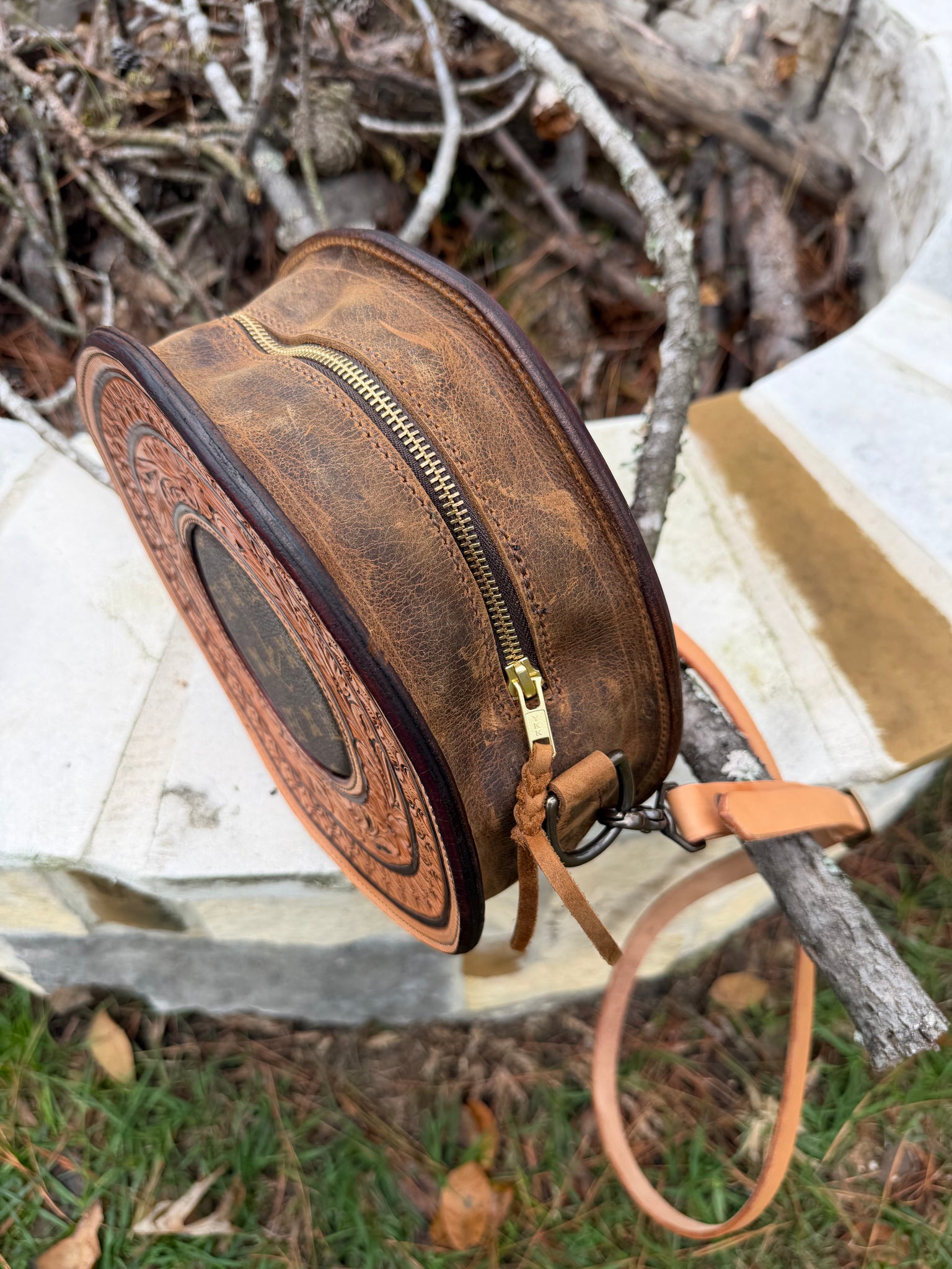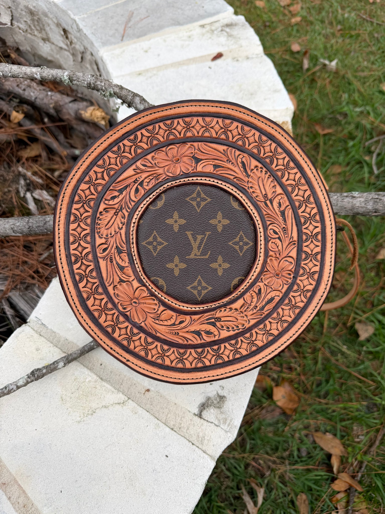 Hand tooled purse with LV inlay and lining throughout. The strap is adjustable and measures at 50” to the center hole.